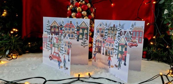 20. Kerstkaart, 3-delige kaarten dorphuisjes, set van 4 kaarten (2x2), 14,5x14,5cm
